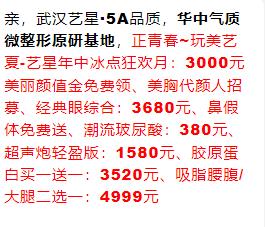 仲夏星顏為美加冕,武漢藝星給大家送美容福利啦,3000元美麗顏值金免費(fèi)領(lǐng)、美胸代顏人招募、經(jīng)典眼綜合:3680元、鼻假體免費(fèi)送,美容福利多多,大家不要錯(cuò)過(guò)喲!