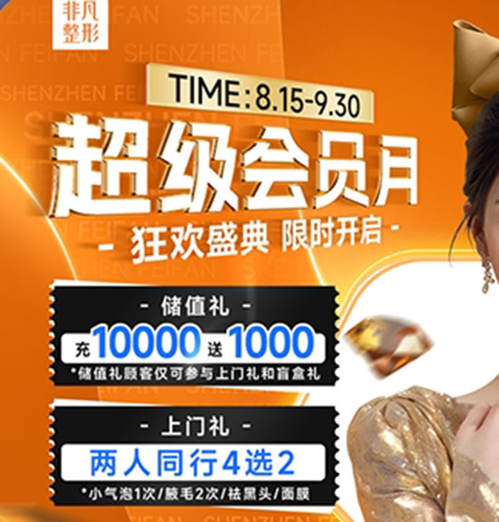 8月15日-9月30日深圳非凡狂歡盛典限時(shí)開啟兩人同行4選2(小氣泡1次/腋毛2次/祛黑頭/面膜),充10000送1000。
