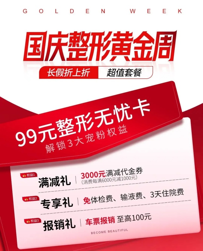 抓住整形黃金周!99元讓你變美之路省錢又省心,活動時間:10月1日-10月7日