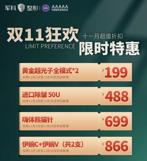 重慶軍科整形雙十一美麗狂歡福利來襲!驚喜滿滿,超值享美!驚喜多多,寵粉特惠!活動時間:即日起-2024年11月30日