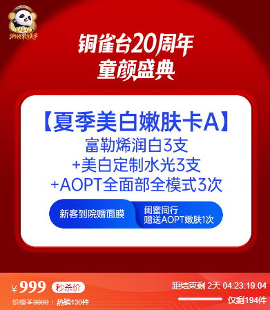 重慶新銅雀臺超值20周年慶特惠,夏季美白嫩膚卡A卡,999元,輕松美白嫩膚。