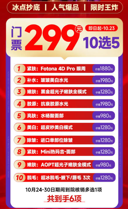 佛山美萊周年慶放大招「終極閉館」冰點抄底火熱開啟,299元門票=10大爆款項目任選5,10月24-30日到院核銷加送1項,299元共到手6項,推薦新友購買,核銷再加送1項圖片上不封頂,三張不到拿下萬元項目,太值了!