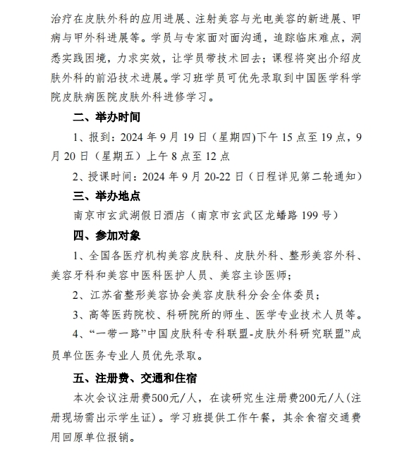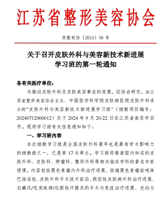 皮膚外科與美容新技術(shù)新進(jìn)展學(xué)習(xí)班定于2024年9月20-22日在江蘇省南京市召開,本次繼教學(xué)習(xí)班是全國(guó)皮膚外科比較早也是比較有學(xué)術(shù)影響力的繼教班。