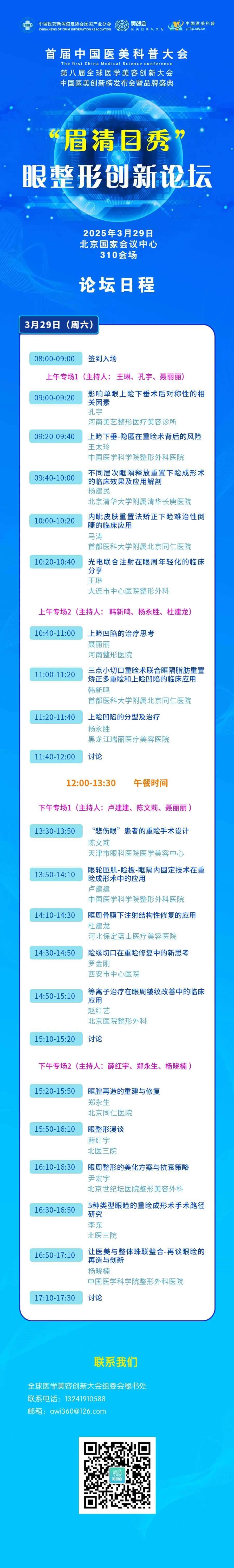 第八屆全球醫(yī)學(xué)美容創(chuàng)新大會(huì)中國(guó)醫(yī)美創(chuàng)新榜發(fā)布會(huì)暨品牌盛典將于2025年3月28-30日在北京國(guó)家會(huì)議中心舉行,眉清目秀·眼整形創(chuàng)新論壇日程如下。