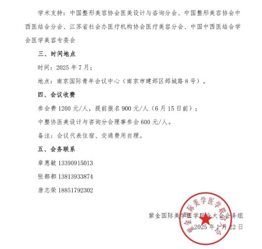 紫金國際美學(xué)醫(yī)學(xué)聯(lián)合大會(huì)會(huì)務(wù)組將聯(lián)合國內(nèi)外相關(guān)醫(yī)美學(xué)術(shù)組織與機(jī)構(gòu),于2025年7月,在南京國際青年會(huì)議中心舉辦“2025紫金國際美學(xué)醫(yī)學(xué)聯(lián)合大會(huì)&第十一屆中整協(xié)醫(yī)美設(shè)計(jì)與咨詢分會(huì)”,本次會(huì)議以大會(huì)報(bào)告、專題演講、圓桌會(huì)議、手術(shù)演示、大賽等方式,圍繞“美學(xué)醫(yī)生與整形藝術(shù)、輕醫(yī)美與皮膚管理、整合年輕化、私密美學(xué)整形、醫(yī)學(xué)美學(xué)設(shè)計(jì)與咨詢以及醫(yī)美營銷與運(yùn)管”等主題進(jìn)行學(xué)術(shù)交流與會(huì)議展覽活動(dòng),歡迎廣大醫(yī)美同仁積極參與。