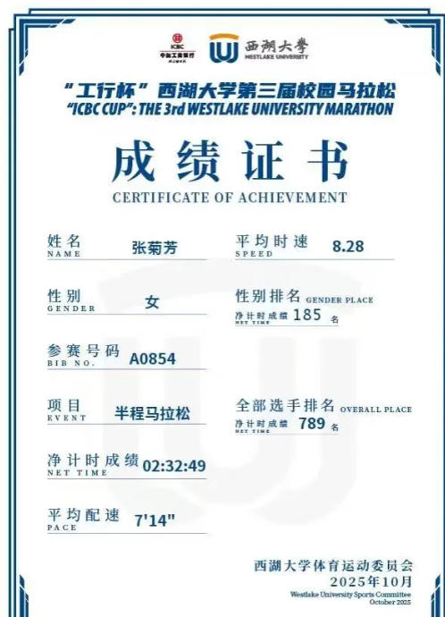 西湖大學(xué)校園半馬的起點(diǎn),第一次在奔跑中認(rèn)真欣賞校園風(fēng)景。每跑過(guò)一段路,都忍不住想“原來(lái)西湖大學(xué)的校園還有這么美的角度”。奔跑途中有被跑友刷刷刷像風(fēng)一樣的超越,有被張衛(wèi)英老師帶著節(jié)奏跑的溫暖時(shí)刻;當(dāng)跑到第五圈雙腿像灌了鉛一樣沉重,全身被汗水浸透,曾經(jīng)想放棄的念頭一次又一次被自己否決。當(dāng)沖過(guò)終點(diǎn)線(xiàn)的那一刻,張菊芳會(huì)長(zhǎng)的呼吸都帶著難以抑制的雀躍。接過(guò)紀(jì)念牌的瞬間,她心中有了更深的感悟:原來(lái)“第一次”的意義,不只是完成一場(chǎng)比賽,更是解鎖了一個(gè)更勇敢的自己。這份激動(dòng)與喜悅,將和當(dāng)天的微風(fēng)、沿途的風(fēng)景一起,深深烙印在她的記憶里。