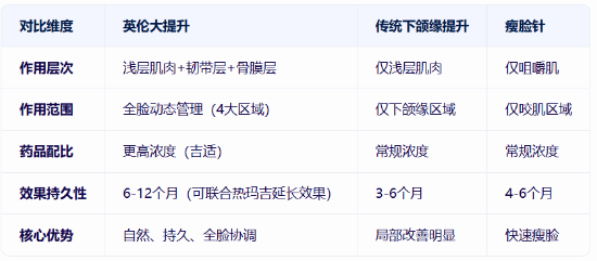 英倫大提升以英國品牌吉適(中國第三款獲批的A型肉毒毒素)為核心,通過多點(diǎn)位注射至真皮或肌肉表層纖維連接處,實(shí)現(xiàn)三大效果: