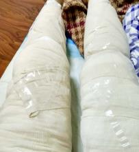 大腿吸脂手術(shù)當(dāng)天,因為手術(shù)采取的是全麻,所以過程中沒有什么痛苦,今天主要就是是不是得流出液體比較煩,但是這個也是正常的現(xiàn)象,兩條腿包裹的很嚴(yán)實。